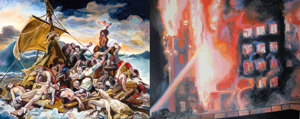 It varies considerably. It usually starts with an idea of what I want to say. Then the thinking around how I might say it. Then the research and organising of that research which may or may not include painting from life or from photographs. Then building the canvas.