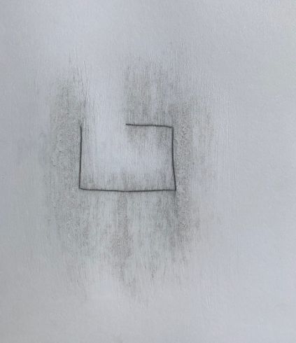 “I continued drawing little landscapes and then towards the end of May moved into making very tiny drawings, almost not there, that feel like stains or bruises on the paper. They are about sounds – I have been listening to a lot of birdsong on my morning walks with my dog.