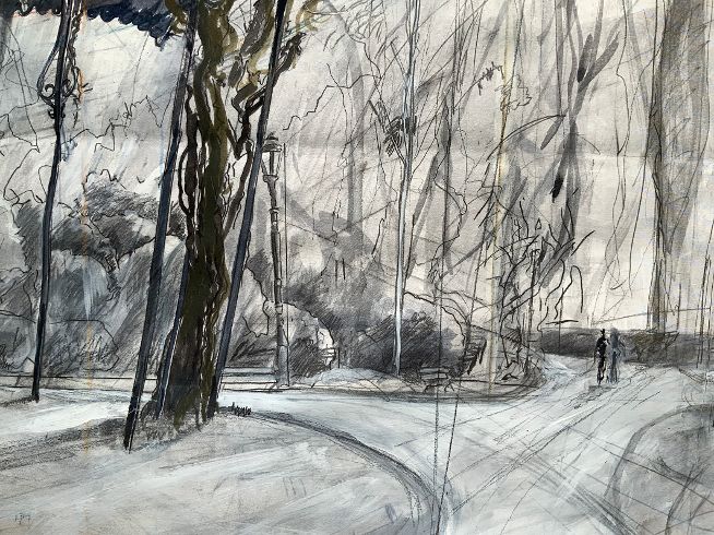 “I am slowly continuing to research, draw, and prepare plates for two new large prints, spending more time at each stage of development, in shorter sessions than usual. I have also appreciated a time to reflect. Walking and cycling locally I have discovered previously unknown locations which have generated new, exciting ideas to develop.