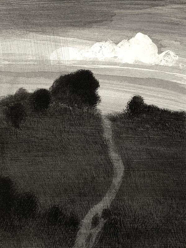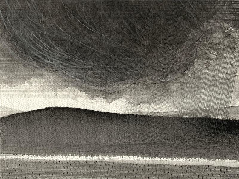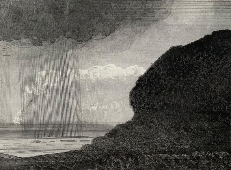 “I’d been drawing the weather and as the rain dried up I made my own. Alongside these miniature landscapes I’m working on a series of larger drawings loosely based on characters from the Tempest. The landscape and the figure are colliding in the storm.