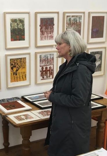 I have been involved in the Friends’ committee for over three years and it is my job to organise the ‘Meet the Artist’ events that take place on Saturday mornings. The photograph shows me at Yvonne Crossley’s studio last year. It is one of the privileges of the role that I am able to visit the Academicians in their working spaces and hear about their work.