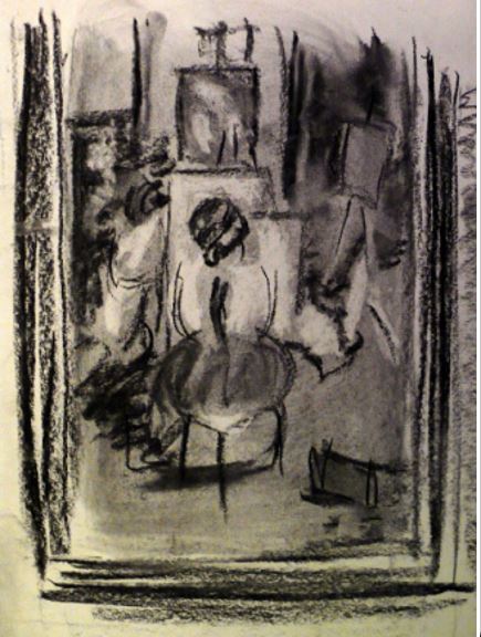 This picture reminds me of the joy and intense work of the life drawing room, and of the special trust that can be built up over time between the students, teacher and model. A painting from the RWA collection –‘The Life Class’ by Miss M. Kerry – provided the main source of inspiration for a life drawing session at the RWA Drawing School. It became our subject for the day, together with our fellow students, our easels and life model. My drawing that day was utterly, utterly atrocious – a bad cartoon of the room and its contents. With five minutes to go, I realised there was something missing in the middle of my drawing: I hadn’t drawn Miss Kerry’s painting which was hanging on the wall right in front of me. I dashed it off – just 15cm x 20cm. The result caught the attention of a fellow student whose work I greatly admired (and who turned out to be a professional portrait artist of some renown). I was well chuffed!
