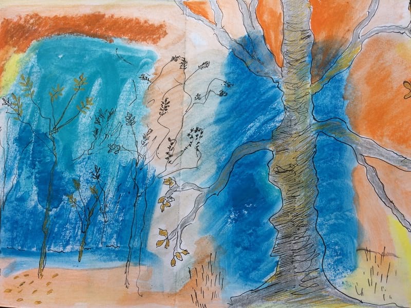 Thanks to the Bristol School of Art, as an adult, I studied many aspects of art – such as life classes, oil painting, enamelling, printing. Having a sketchbook has meant most to me, as each sketch is full of memories. This drawing is an extract from my sketchbook. It doesn’t represent anything in particular, just shows my enjoyment of colour and the different ways of mark making.