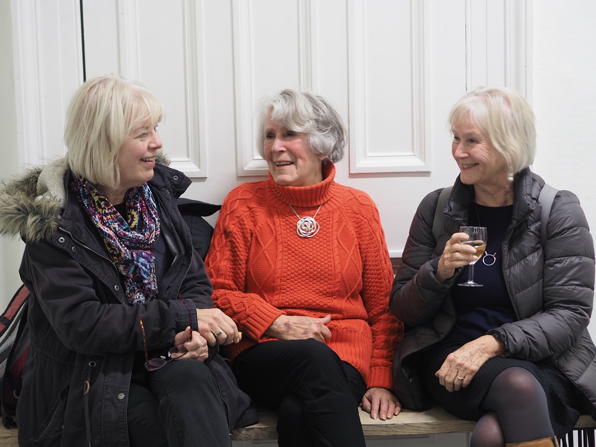 Photo top: Suzanne Ewart, Ann Baber and Jane Boot at the ‘Small is Beautiful’ private view in 2019. Photo credit: Angus Gregson
