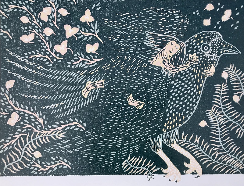 “My work is based between the outer world of nature and the inner world of imaginings. Working with woodcut I am inspired by landscape and by narrative, fairy tale, current events, and to both personal and cultural story. I work in relief printmaking by the reduction method, using Japanese plywood, cutting out the colour I want to keep, in each layer. You cannot go back with the reduction process, any ‘mistake’ has to be worked with and at the end you are free to start a new print as you cannot ever print it again. I also work in clay while exploring the narrative in which I am currently interested. I like working in two very different mediums and did the same for an exhibition on Migration which was held in early October 2020, between the two major national lockdowns. I made prints about Mexico, imaginary animals trying to migrate but coming up against Trump’s wall. I also made a flotilla of clay boats and passengers, people and animals, at risk through social change, war, and climate crisis.”