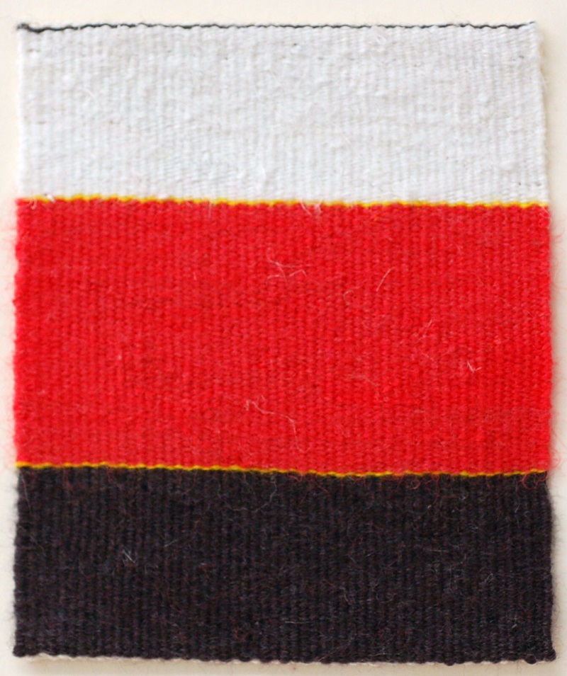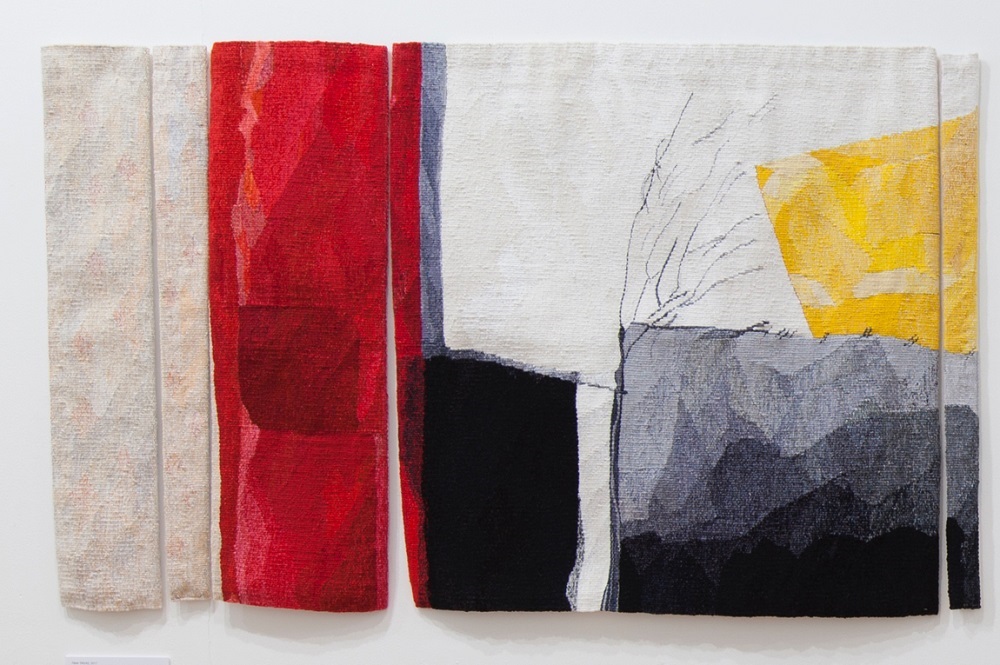 “New World was inspired by my new surroundings, having returned to Bristol. Although city-based, my outlook is S/SW and we look through the treetops and stunning sunsets – shafting colour down the tree trunks. It was woven over a period of months, so I made it in segments referencing the time span. Submitting for an OPEN is always nerve-wracking but when it was accepted it was life affirming. I draw a lot before committing to the weaving, sampling colours: a slow process before the weaving begins.