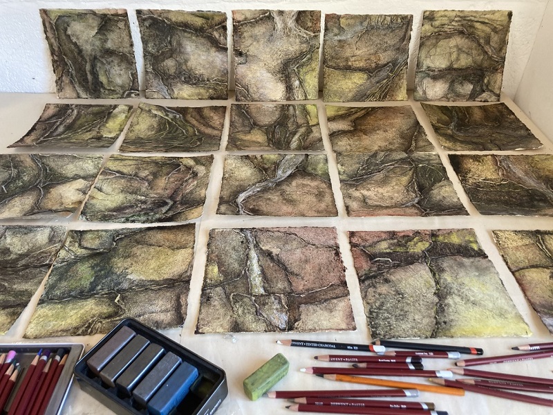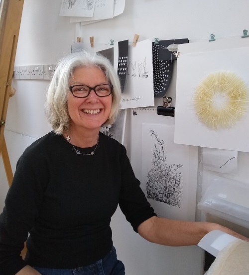 “I work fluidly across and between textiles and drawing, reflecting my love and passion with the created world around me. I have two paper textiles in the RWA 168th Exhibition: ‘Rambling Collections’ and ‘Field Notes’.