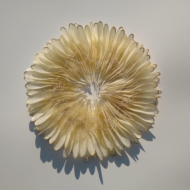 “The paper feathers in ‘Rambling Collections’ are cut out individually, and contain their own history. Each is drawn on, folded and finally gilded with gold leaf. Each feather is hand-stitched and knotted slowly, using vintage silk threads. ‘Field Notes’ is in response to the series of landscape drawings made over the last year.”