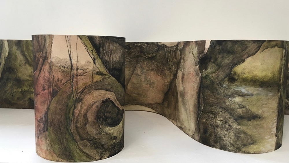 “These recent scrolls and elongated drawings incorporate brief, incomplete glimpses of landscapes: ambiguous views placed alongside detailed observations of what was near; employing mark-making and materials which recollect the sensory pleasure of being immersed in the landscape and the reverie that walking gives way to.”