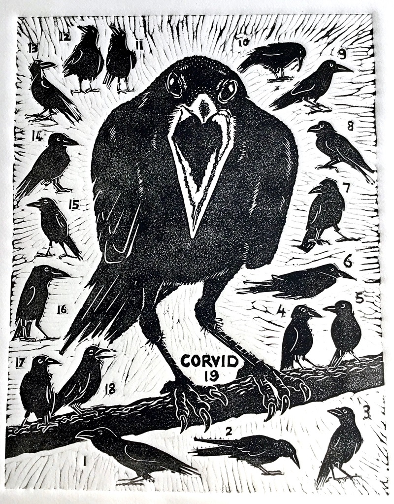 “‘Corvid-19’ was an idea rattling around in my head all year. We had a lockdown ‘Inktober’ family challenge which inspired me to draw more with ink without any preliminary pencil. So I decided to draw the Corvid-19 idea with pen, chopstick and ink straight into a sketchpad. Then the idea of making a print from it kept nagging at me. As an artist who has made quite a few artworks about corvids I just really liked the similarity between ‘covid’ and ‘corvid’ so the idea of drawing 18 nice little corvids and a 19th aggressive monster worked. I really enjoyed giving each one of the first 18 corvids a happy character of its own and then making the 19th as monstrous as possible.