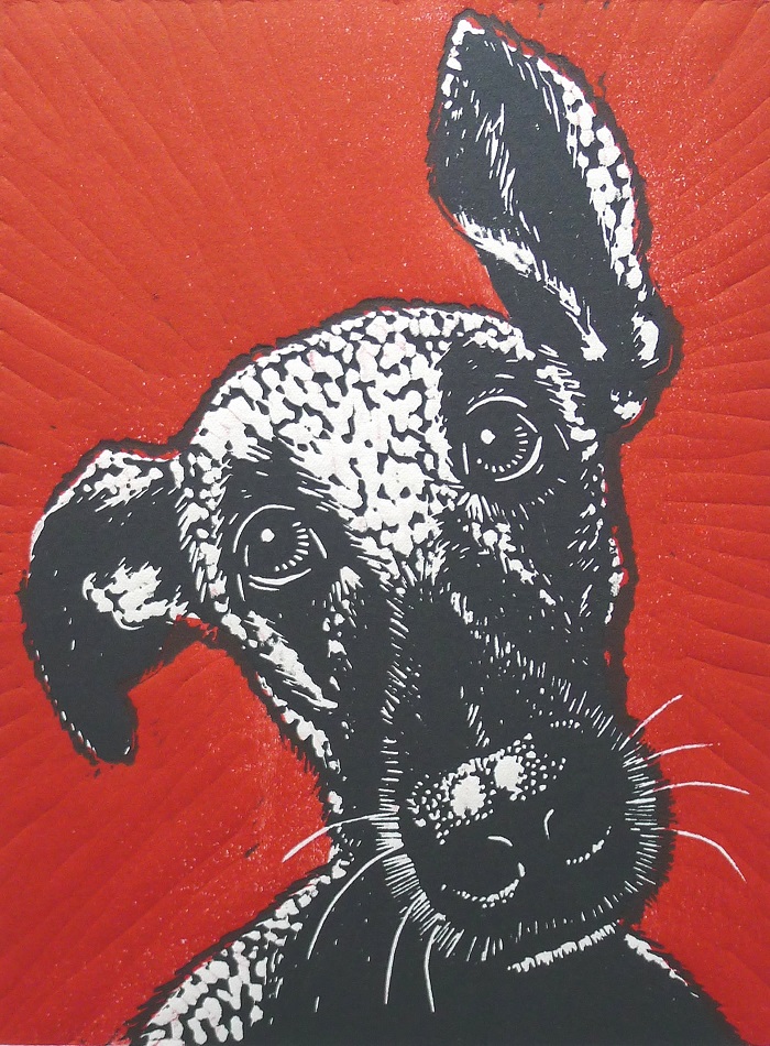 “‘Little Red Dog’ is the first in a series of dog portraits of the Galgos dogs from Spain. Originally, the print was monochrome but I thought it would be good to create a bold coloured background so I cut away the background from the first lino plate and created a second plate to print the red background. One of the huge challenges with printing is the actual printing process – it’s rife with difficulties – too much/too little/patchy ink rolled onto the plate; uneven pressure/not enough pressure through the press; creased paper; paper too damp or too dry etc.