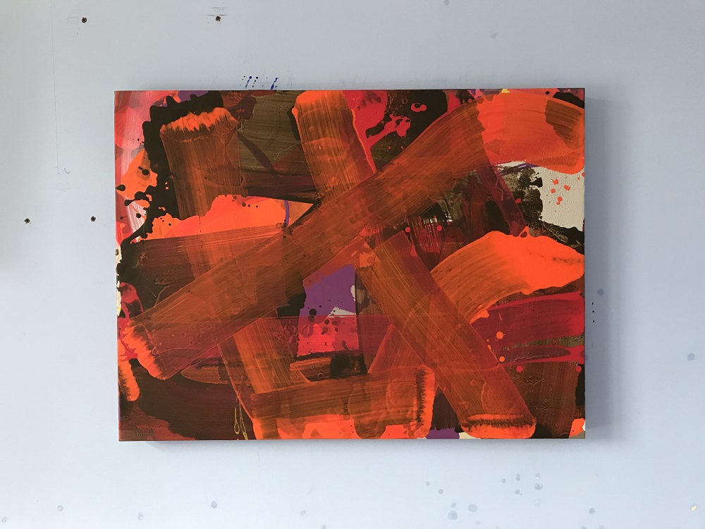 ‘Danabyr’ has the colour proposition of analogous red/orange turning into umber, applied in semi-transparent bars of colour that weave in and out of each other. Some of it was executed wet-into-wet, which led to gradated transitions from one colour to the next, whilst other areas were applied once a previous layer had dried, leading to more abrupt changes. I’m interested in trace patches of colour being present also – you see this beautifully incorporated into Christopher Wood’s late works – which operate as ‘tart moments’ in the overall colour schema, hence the purple and light grey.”