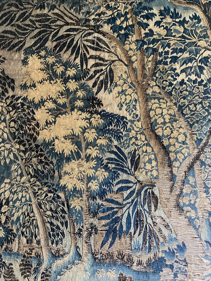 When it was conserved by the V&A  the design, with its exotic trees and flowers, was identified as ‘new world’, a product of 16th century expeditions and early colonisation by such as Drake and Raleigh.  Taking down the tapestry, it was found to be attached to the walls by lead nails which could be dated to 1601.
