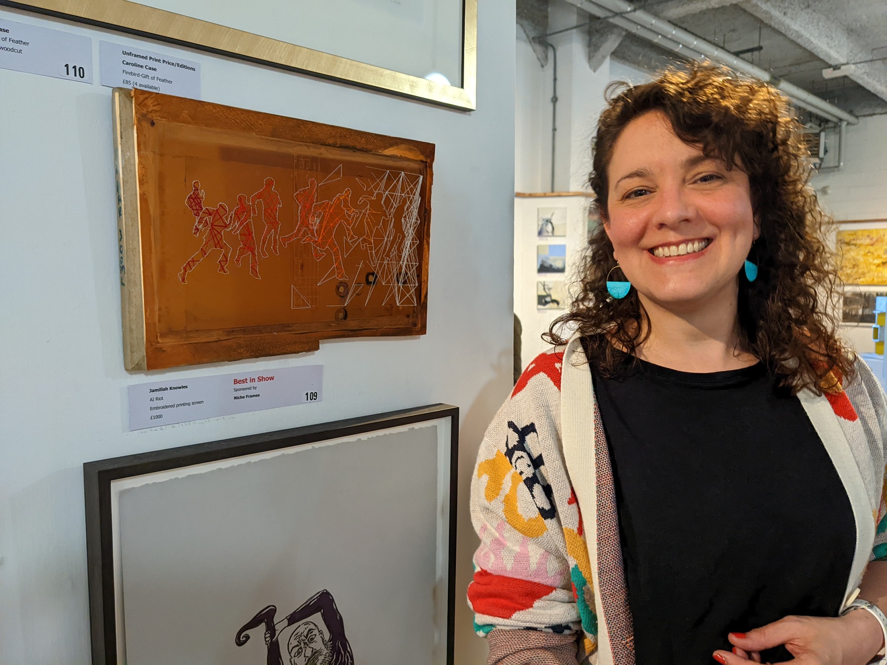 Based in Bristol, Jamillah Knowles is an artist, writer and the former host of BBC Radio 5Live’s Outriders program. With a special interest in technology and a degree in artificial intelligence, her work uses images, sculpture and multimedia to challenge popular ideas around AI. Jamillah is also a Friend of the RWA, and at the 2022 Friends’ Exhibition she won the Niche Frames ‘Best in Show’ prize for her striking work using embroidery on a printing screen, AI Riot.