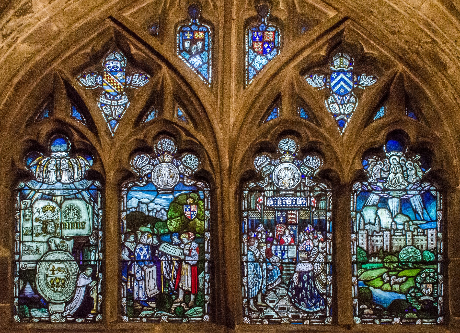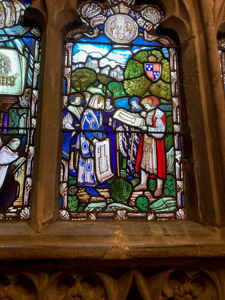 The windows are the work of Archibald J. Davies, a member of the Bromsgrove Guild, associated with the Arts and Crafts movement. They were installed in 1923, when it seems the role of John Stanbury in the founding of Eton College was deemed to be worth commemorating. Was this his only achievement?