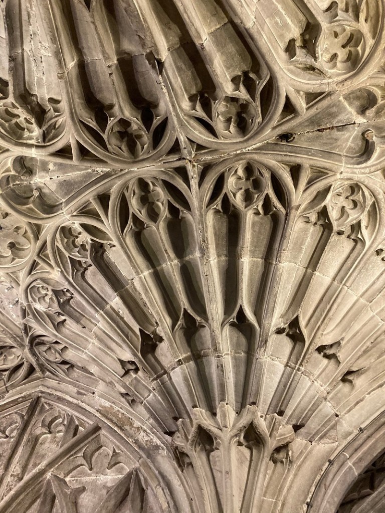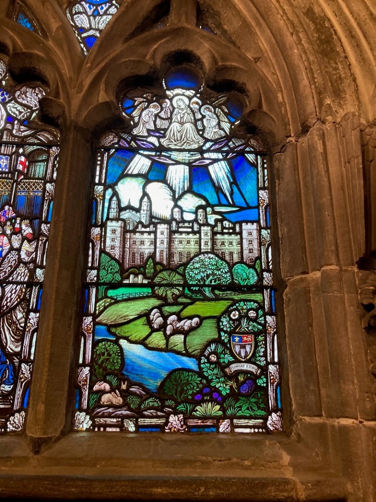 It is a tiny, intimate space with exquisite fan vaulting crammed into every part of the ceiling. Part of the last medieval additions to the cathedral, the chapel was created in 1480 as a chantry where masses were said for the soul of the recently departed Bishop. It’s possible to sit, quiet, in the enfolding, enclosing space. Then, look around. Sunlight illuminates two sequences of stained glass.