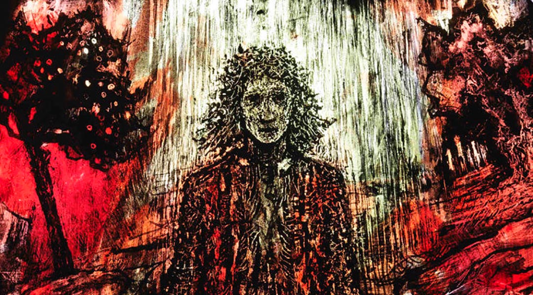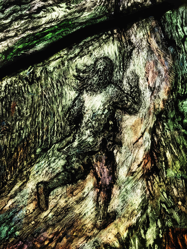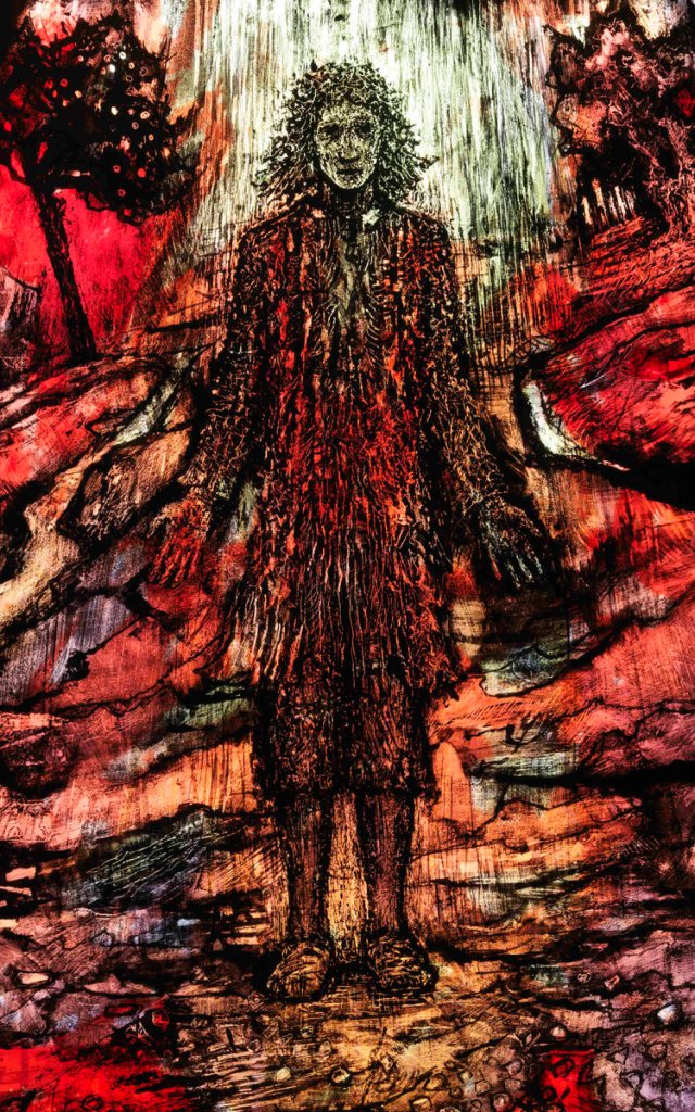 With looking, the light touch symbolism of water, light, the winding path, the open handed man, the birds, emerges. Up close the details of insects, animals, birds, trees, a distant Hereford, people’s faces, a woman’s waterfall like hair, fascinate and intrigue.