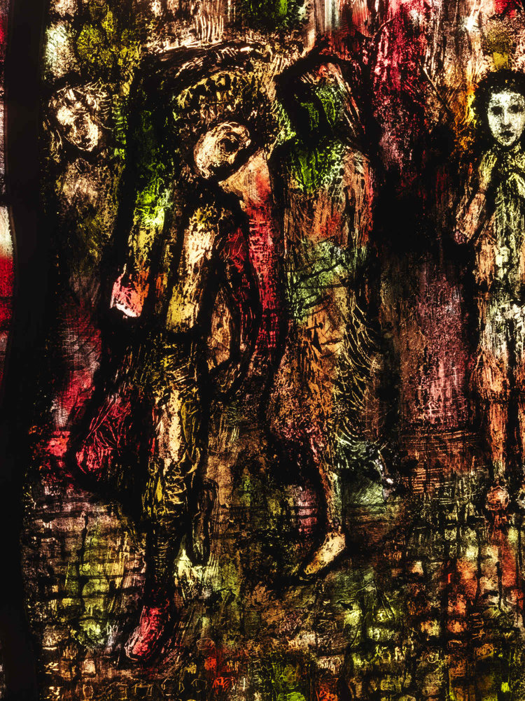 As explained by Denny, the starting point of a design is the shapes that will be held by the leading, and the defining colours. The clear glass is flashed with colour and then worked on in a variety of ways: brush painting, acid etching, staining, scraping or rubbing back, producing a range of textures. ‘I always work back to light,’ Denny says. The glass will be fired two or three times before the final leading. This complex process produces the narrative within and between the windows, and the hugely powerful emotional impact of colour and light.