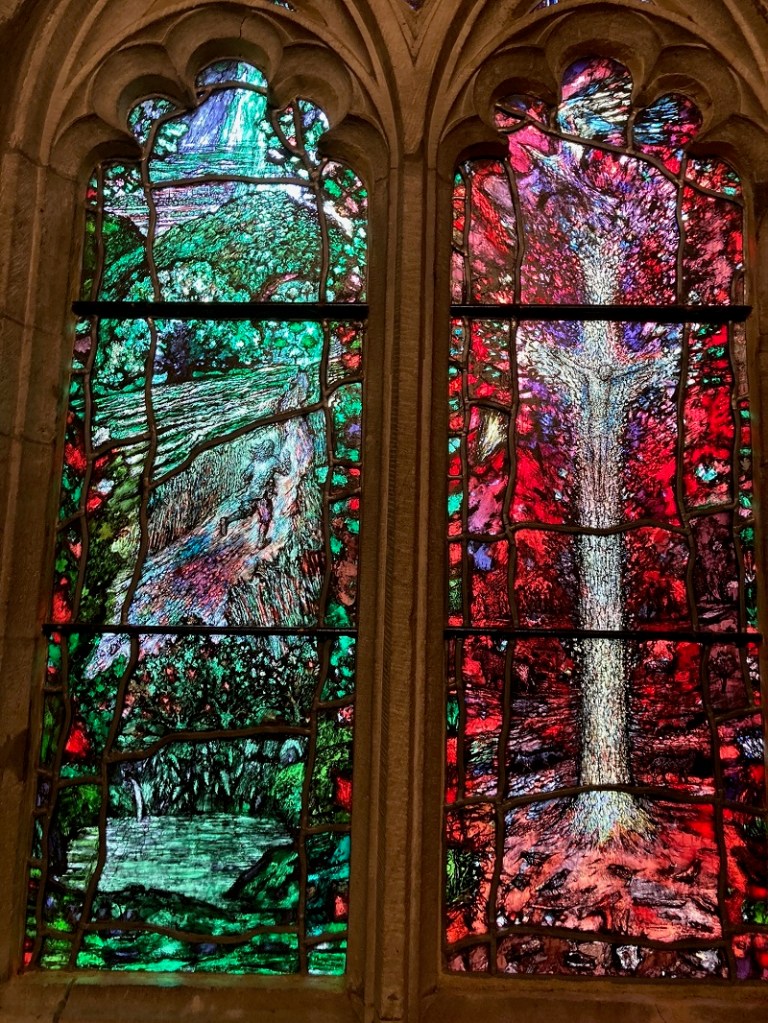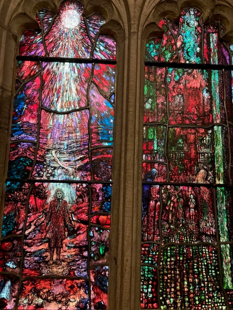 A few steps from the Stanbury Chapel, is the Audley Chapel. Another chantry for another bishop, Edmund Audley, bishop of Hereford from 1492-1502. Its small space is entirely devoted to four stained glass windows by Thomas Denny. On the day of my visit the weather was bright and the chapel was filled with the rich red and green tones of the glass. The effect was stunningly beautiful and immediately engaging. The images on the glass – a running man, a pool, a crucifixion/tree of fire, a man standing in a stream of light – sparked associations and invited closer looking. What was the story behind this installation?