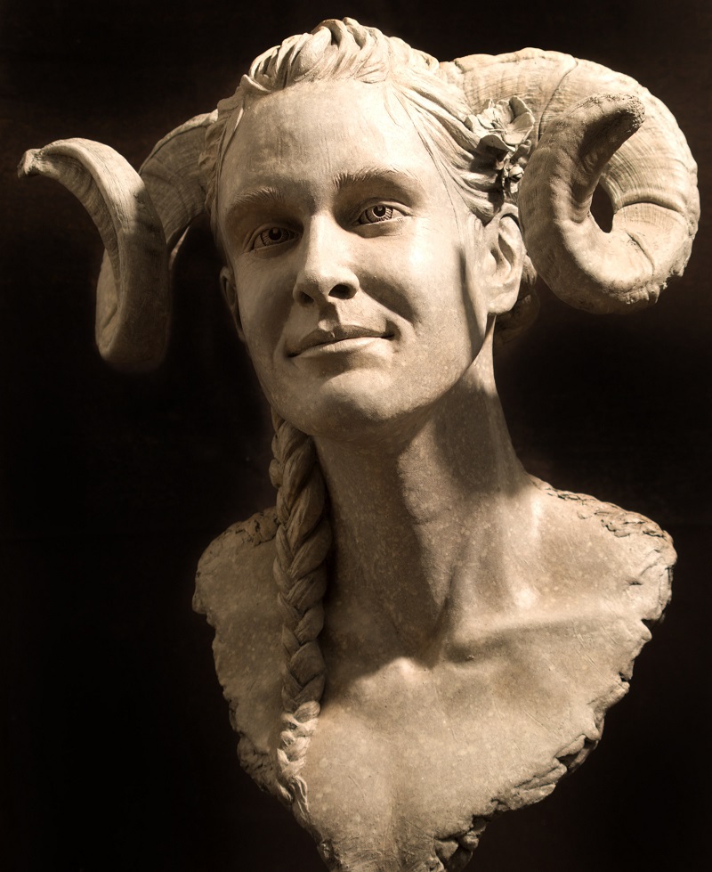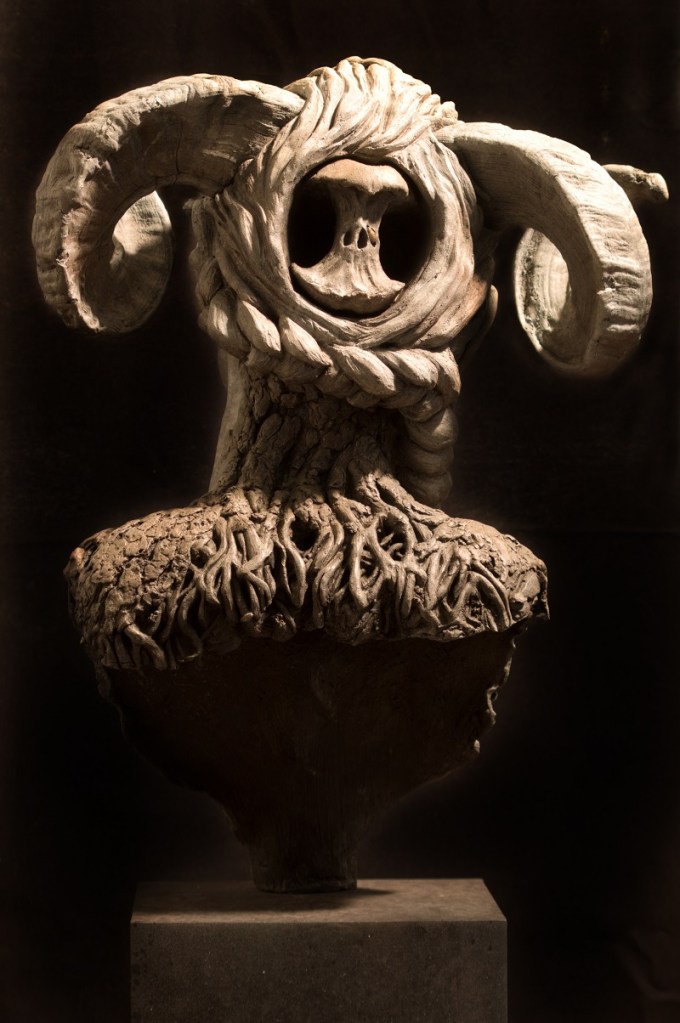 Sthénos is the bust of a Grecian nymph (an Epimeliad if you want to get technical: the nymph of sheep and apple trees). She’s the work in which I explored invisible illness and the detrimental habit we have of responding ‘I’m fine’ whenever anyone ask how we are. And that is exactly how she looks: fine. She has a slightly unreadable smile, shaped by neither joy nor amusement, but all you have to do to reveal the truth of the situation is walk behind her where she transfigures into a tangle of roots and bark and the back of her head gapes, revealing the core of an apple. This is the difference between looking fine and being fine.