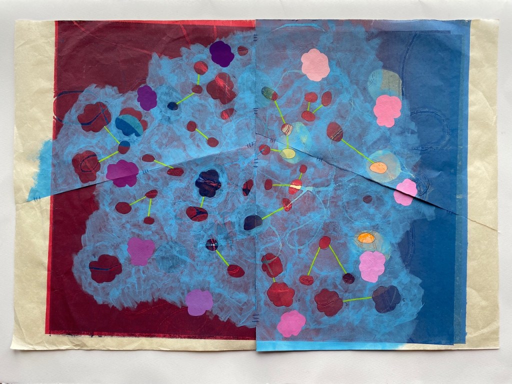 Music-inspired art. Visual Jazz… dissonant tones coalesce on canvas to create vivid colour harmonies. As with many abstract artworks we may be immersed in moving contours of form and colour. Or perhaps, before our eyes, order manifests from chaos so that the paintings modulate into recognisable forms; A feeling evoked from imagined or forgotten memories.