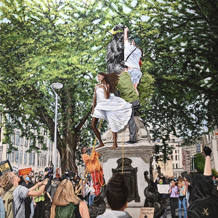 It is often difficult to imagine how the public is going to react to your artwork when you are sitting alone in your studio busy designing or executing a particular piece. ‘A Bristol Story…’ is a good example because of the controversial nature of its theme. In my mind this moment in time needed to be painted. I felt compelled to show the viewers that although Bristol has a dark past regarding civil rights, the Bristol of today is a multiethnic and multicultural city that is not afraid to show the world where it stands. I’m also very proud that our small city of Bristol sparked a chain of events that reverberated around the world inspired by the ‘Black Lives Matter’ movement.