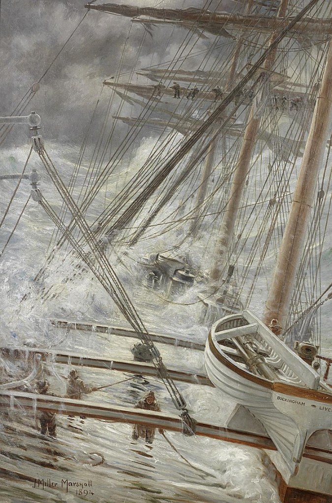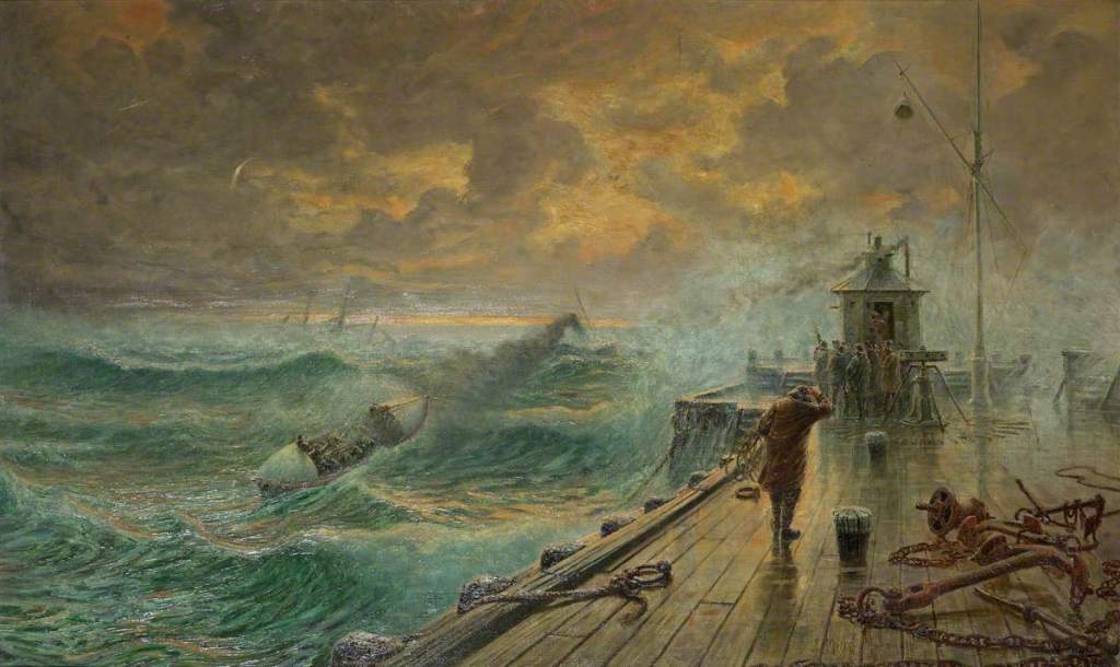Many of us will, I imagine, be familiar with the phrase For Those In Peril On The Sea, from a hymn. It’s also the title of an oil-on-canvas work by John Miller Marshall (1858–1935), dated 1913 and presented by Mrs J. Miller Marshall.