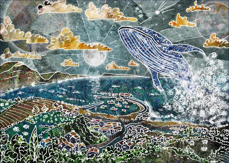 Inspired by the coastal scenery around Lyme Regis, Dave started wondering what may have inhabited the place long ago and what may occur there in the future. His image of a ten-times life-size blue whale, leaping from the sea and about to crush Lyme Regis under its bulk, was inspired by a nightmare he had when he was four years old, but his photomontage of Lyme slipping into a vast chasm in the ‘Great Landslip of 2039’ is hopefully pure fantasy.
