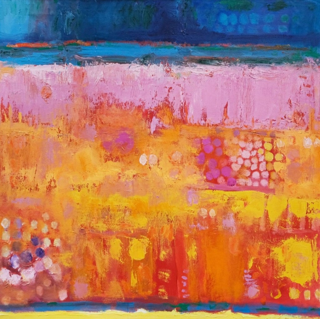 ‘Living by the coast I cannot help but study the sea and be inspired by its complex moods, its ever changing surprises and variety of colour. I strive to make sense of the space between the natural idea of landscape and the creative response to it. At a painterly level, the image may result in neither a literal nor an abstract expression; somewhere in between, a balance of truth and fiction. My painting process is oil on canvas, often with additional collage and drawing to add texture or detail. Scraping through layers of paint allows light and special effects of weather and sky to show through, as well as bright splashes of garden or wildflowers or everyday objects from the shoreline or interior spaces. In the end I hope that my paintings are alive and full of my passion for the excitement of colour.’