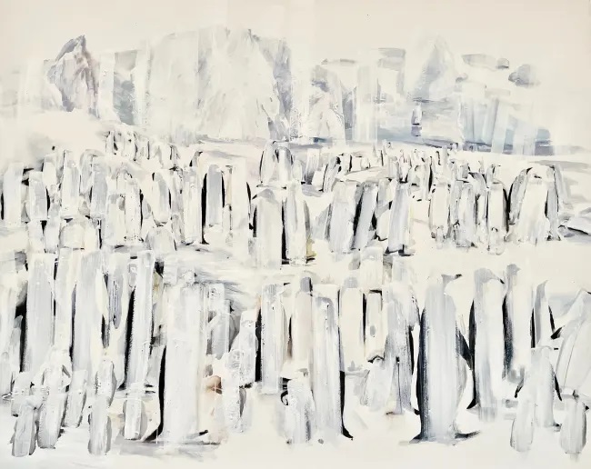Process is an important part of her practice, in a way that echoes the characteristics of her subject. Layering oil paints and paint resists, she then rubs away paint with sandpaper, sometimes inviting the public to erase parts of her work as an interactive performance, in order to emphasise ideas of destruction and loss.