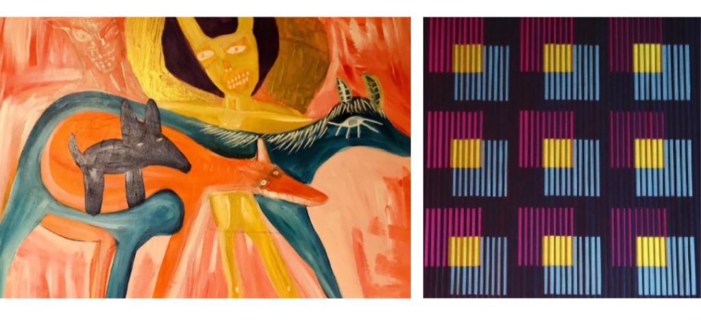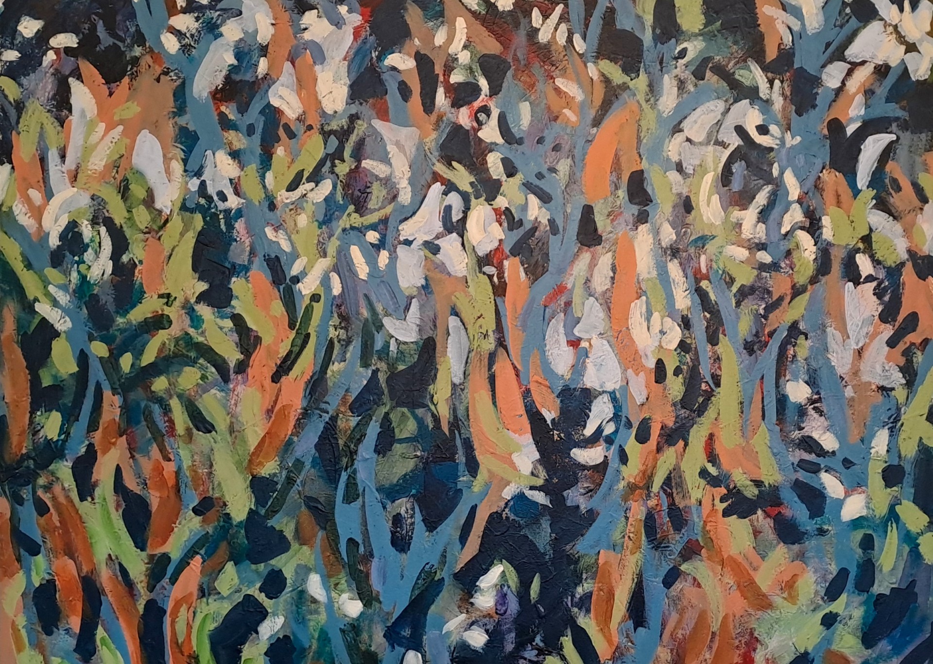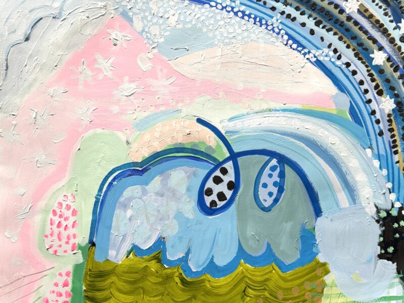 ‘Working primarily in acrylics, I embark on each piece with a multi layered approach, often simultaneously starting several works. The addition of oil bar drawings atop the paintings allows me to knit together space and colour, infusing the artwork with a dynamic energy that reflects the underlying element of fun in my process. My goal is to create art that transcends generational boundaries, making it accessible to all ages. Ultimately, my artwork serves as a visual diary, capturing the essence of the life I lead. Each piece is a collection of my words translated into a vibrant visual language, inviting viewers to immerse themselves in the rich tapestry of my experiences.’