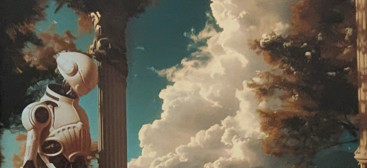 Geoff’s image in the RWA Open right now is a clear exercise in storytelling. “It shows a picture of a dog and a robot,” he says, “which is about showing where we are now with the dog as humanity and the cyborg figure with a sword which represents the future of AI. It’s a benevolent figure and it does hold a sword, so it has potential to do us harm, and the dialogue it is intended to show is that we can work together. The dog doesn’t have to use its teeth and the robot doesn’t need that sword.” The placement of the figures are set in an old style scene with Greek columns and motifs, describing a contrast between history and a possible future.