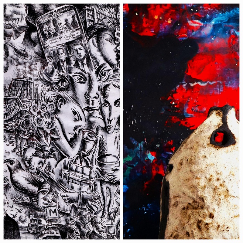 Mike Stuart: The Dark Ages – created as a direct emotional reaction to the current age of anxiety over the last two years, this series of monochromatic painted biro drawings tries to find sense in an unpredictable, precarious world. A stream of consciousness feed, aspiring to explore higher states, but invaded by intrusive thoughts of industrial genocide, growing fascism, rampant consumerism, unaccountable oligarchy, media overload and social isolation, while the world careers blindly towards climate breakdown… Figures scratched in jagged black outlines dug furiously into the paper, jostle with ink-washed shadows in broken urban landscapes. Sharp-edged, gritty, and distorted, but also lyrical, dreamlike, and darkly humorous; the pictures are striving to evolve the ideal form to encompass everything we feel in these dark ages.