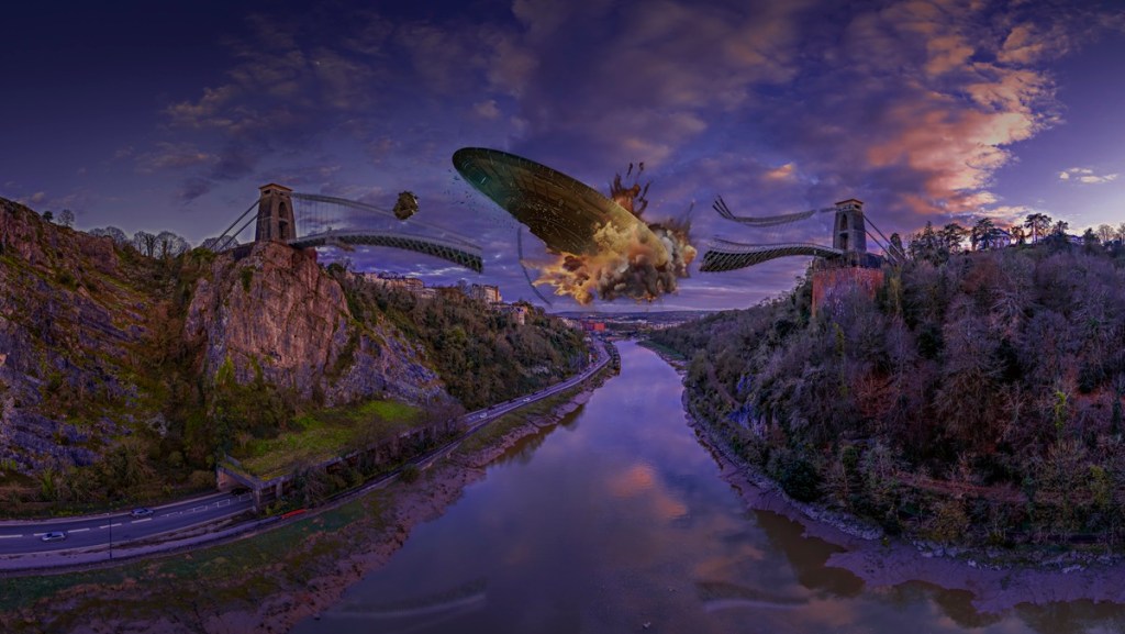 “I had been listening to podcasts about UFOs,” he says. “If you look for pictures of UFOs, they are a little grainy shape in a white sky. I decided to make little grainy images in my photos as a bit of a joke, almost unnoticeable. Then I decided to go the other route, shoot a beautiful cityscape and put an incredible AI generated UFO in there, so there’s no question that it’s there.”