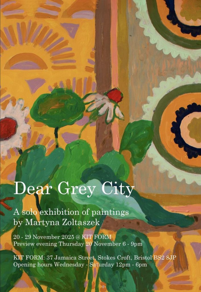 A solo exhibition of the Bristol-based painter, Martyna Zoltaszek. Dear Grey City is Zoltaszek’s love letter to her experience of growing up in Eastern Europe during the 80s and 90s, where drab long winters and concrete architecture formed the backdrop to a family home filled with trinkets, beautiful objects and books.