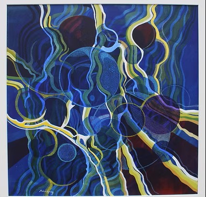 This exhibition will feature three aspects of this artist’s work. The main area will be composed of the colourful and interesting abstract paintings. These paintings are carefully constructed but they are totally unplanned. One feature of ‘Strange Biology’ is that they can be hung any way round. Alongside these paintings will be the Dot and Line drawings that have become very popular recently. In addition to these two ‘abstract’ styles, will be a small number of Gray’s famous caving subjects, pictures that are very suitable for the museum which has a great area devoted to cave exploration.