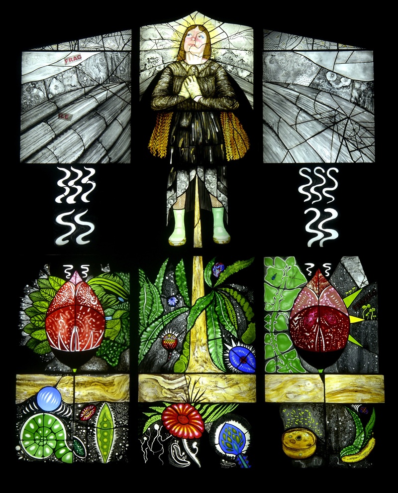 Through stained glass, sound, and film, Earthly Spirits creates an immersive space for contemplation. Here, Pinkie recalls a poignant memory of a young boy learning to play the piano in the church—his music accompanied by the circling flight of a swallow—adding a deeply personal yet otherworldly element to the exhibition’s themes of reverence, loss, and transformation. The exhibition will continue with new and existing stained glassworks, some suspended in front of the gallery windows, emphasising the themes of landscape, memory, transformation, and an alternative future.